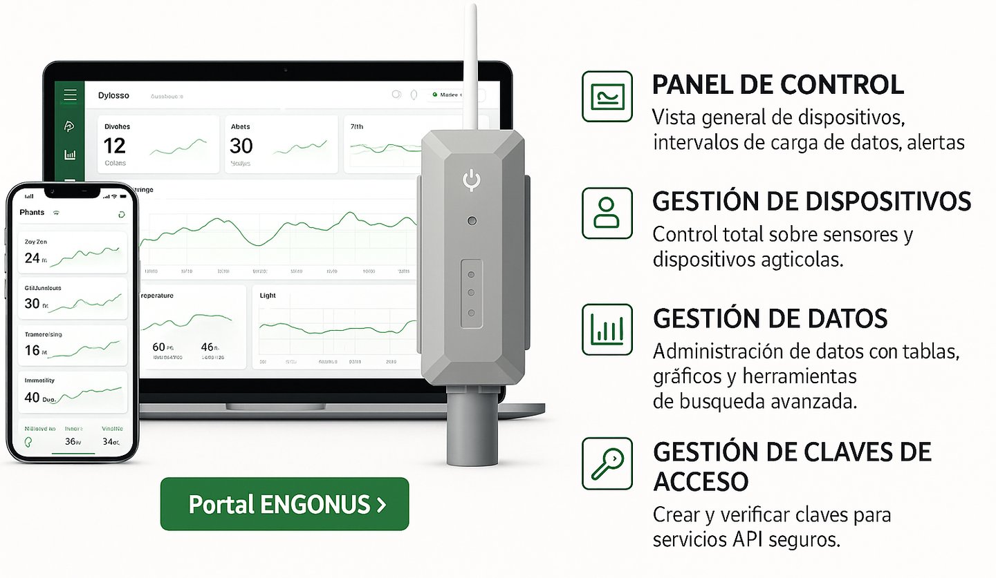 ENGONUS es una solución tecnológica para agricultura inteligente basada en IoT. Permite monitorear en tiempo real parámetros clave del entorno y del suelo mediante sensores, facilitando una gestión más eficiente, precisa y sostenible de los cultivos.
