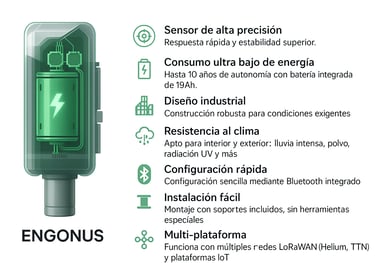 Diseñado para entornos agrícolas exigentes, el sensor ENGONUS combina alta precisión, bajo consumo energético y robustez industrial en un solo dispositivo. Su batería integrada ofrece hasta 10 años de autonomía, permitiendo mediciones fiables y continuas sin mantenimiento frecuente.