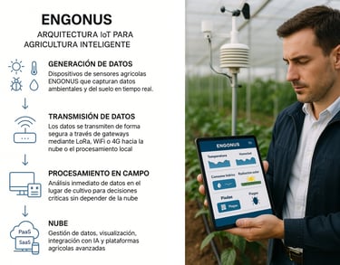 ENGONUS recopila datos del campo a través de sensores agrícolas. Estos datos se transmiten mediante redes como LoRa, WiFi o 4G hacia una plataforma donde se procesan localmente o en la nube, generando información útil para tomar decisiones agronómicas inteligentes.