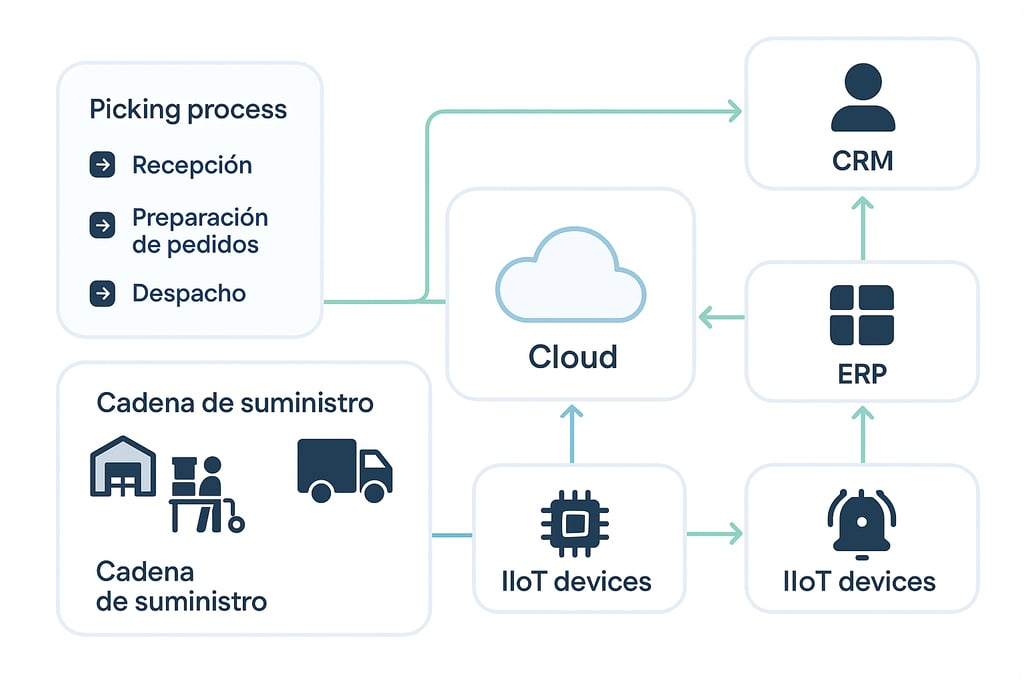Supervisa y controla cada fase del proceso logístico: recepción, preparación de pedidos y despacho, todo conectado con sensores y dispositivos IIoT para evitar errores y retrasos.