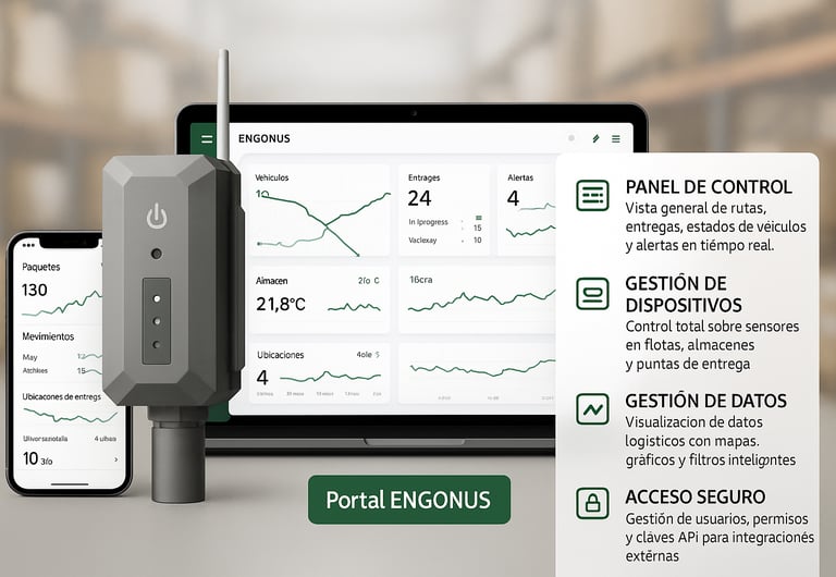 ENGONUS recopila datos en tiempo real desde vehículos, almacenes y puntos de entrega mediante sensores y dispositivos conectados. Estos datos se transmiten vía LoRa, WiFi o 4G a una plataforma donde se procesan en la nube o localmente. Esto permite gestionar rutas, detectar incidencias, optimizar entregas y tomar decisiones logísticas más ágiles e inteligentes.