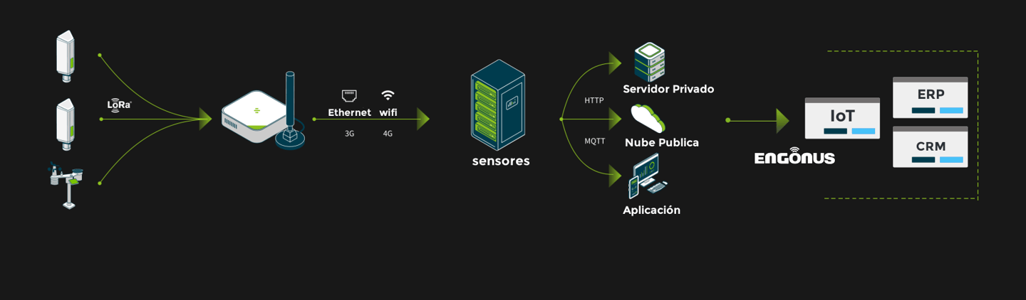 ENGONUS integra en un solo sistema IoT (sensores y dispositivos conectados), ERP (gestión de recursos y procesos) y CRM (relación con clientes), ofreciendo una visión 360° de la empresa. Esto permite centralizar datos en tiempo real y generar inteligencia de negocio de forma más ágil.